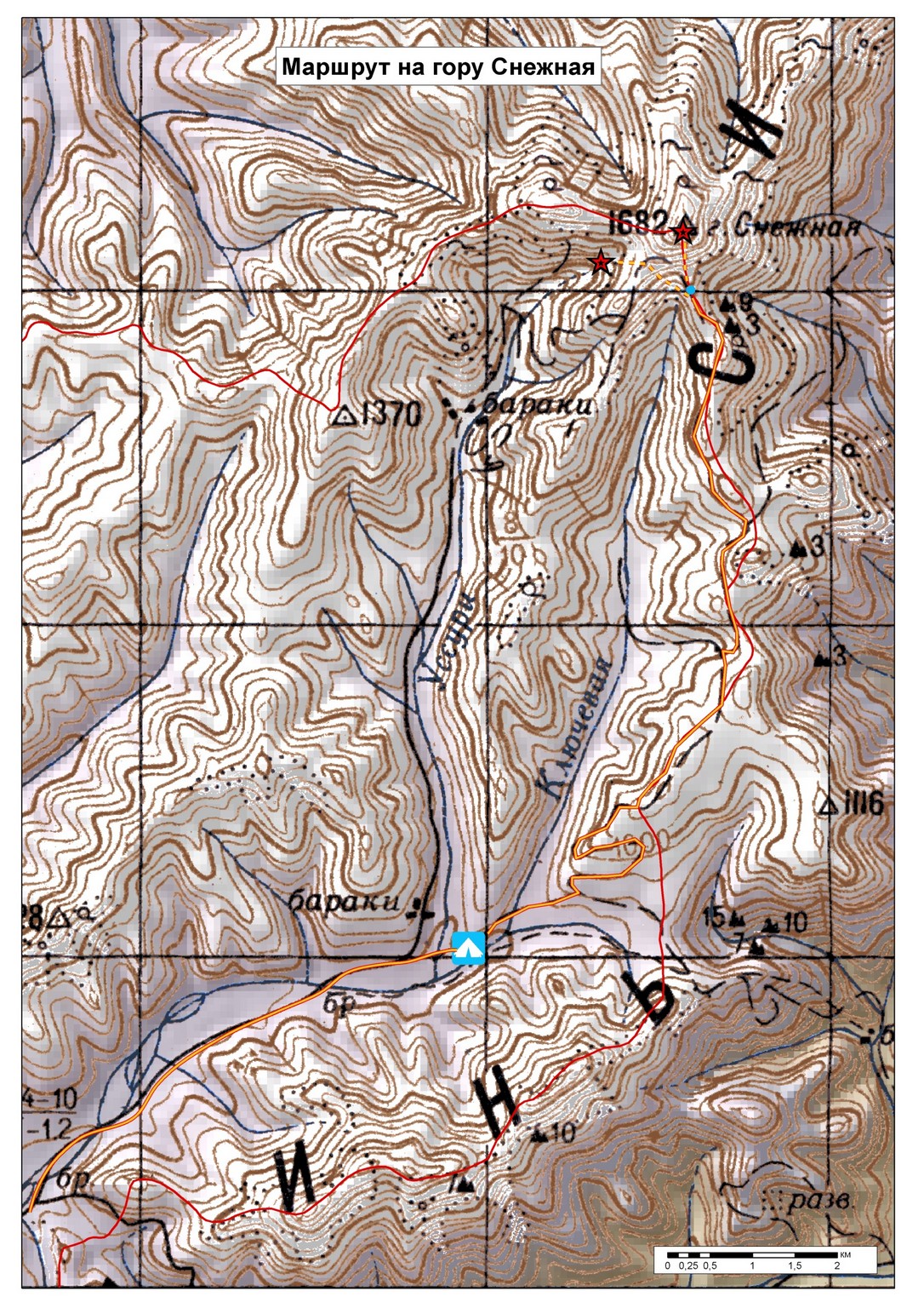 • Подъем от дороги непосредственно на вершину горы Снежная осуществляется по северо-западному склону. Подъем с юга – от истока руч. Ключевой запрещается. Склон здесь очень крутой, покрыт слабо закрепленной крупноглыбовой осыпью. Движение по осыпи может легко привести к травмированию. Маршрут по северо-западному склону в данное время маркируется.